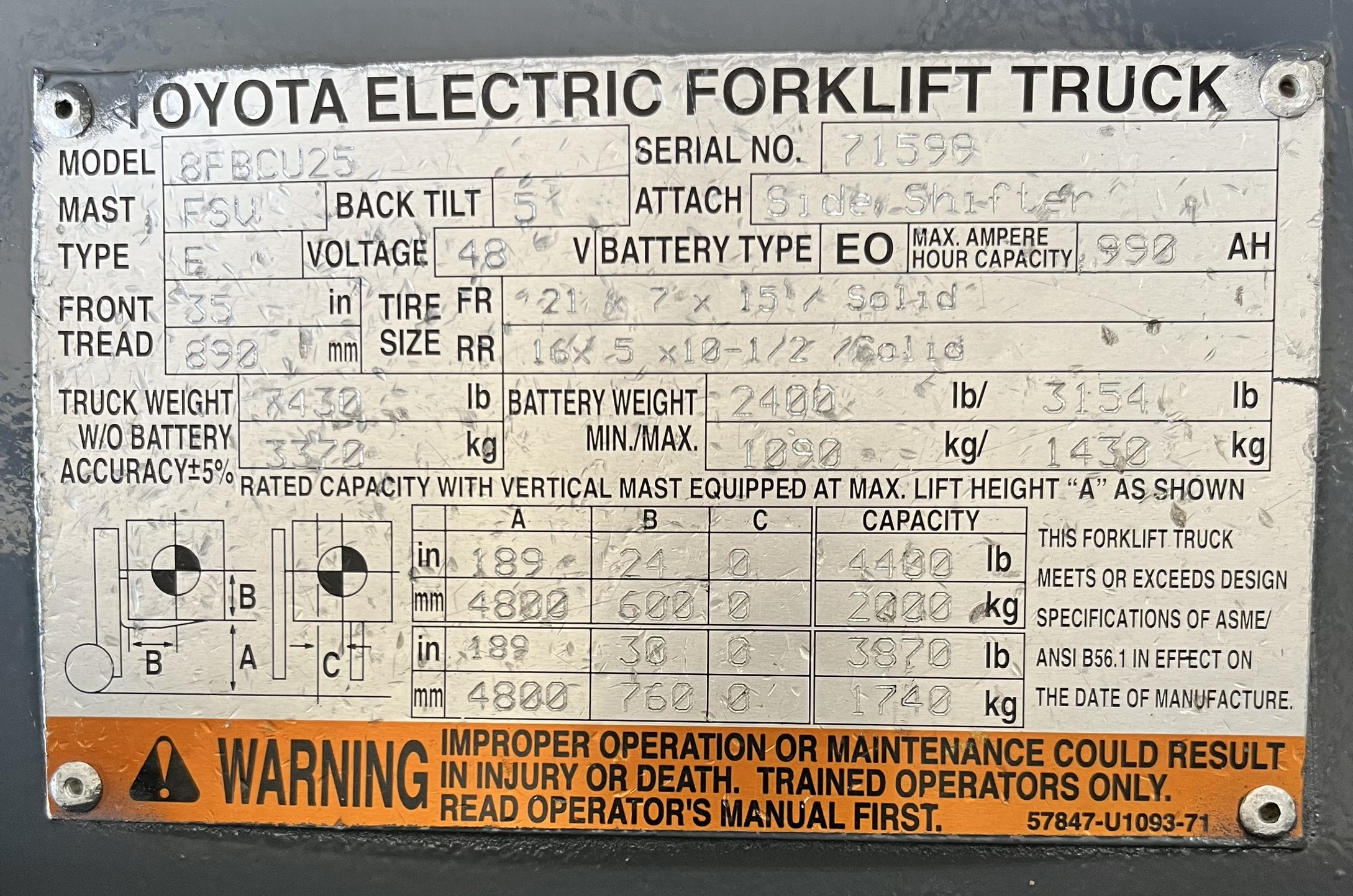 *SOLD* 2019 TOYOTA 8FBCU25 ELECTRIC 5000LB CUSHION TIRE FORKLIFT WITH NON - MARKING TIRES* (262) 547-6637 $19,950.00 Contact for Availability Apply for Financing View Rental Pricing Fuel: Electric Capacity: 5,000 lbs. 3 Mast: 3 Stage Year: 2019 Make: TOYOTA Model # 8FBCU25 Serial # 71599 Hours: 7,971 Side Shifter: Yes Condition: Used Watch this lift in action! YEAR: 2019MAKE: TOYOTAMODEL: 8FBCU25S/N:CAPACITY: 5000HOURS: 7971CUSHION NON-MARKING TIRESLIFT HEIGHT: 189"42" CLASS II FORKSPOWER STEERINGSIDE SHIFTFORKLIFT DIMENSIONSL: 86" W: 43" H: 83"CARRIGE: 36.25"