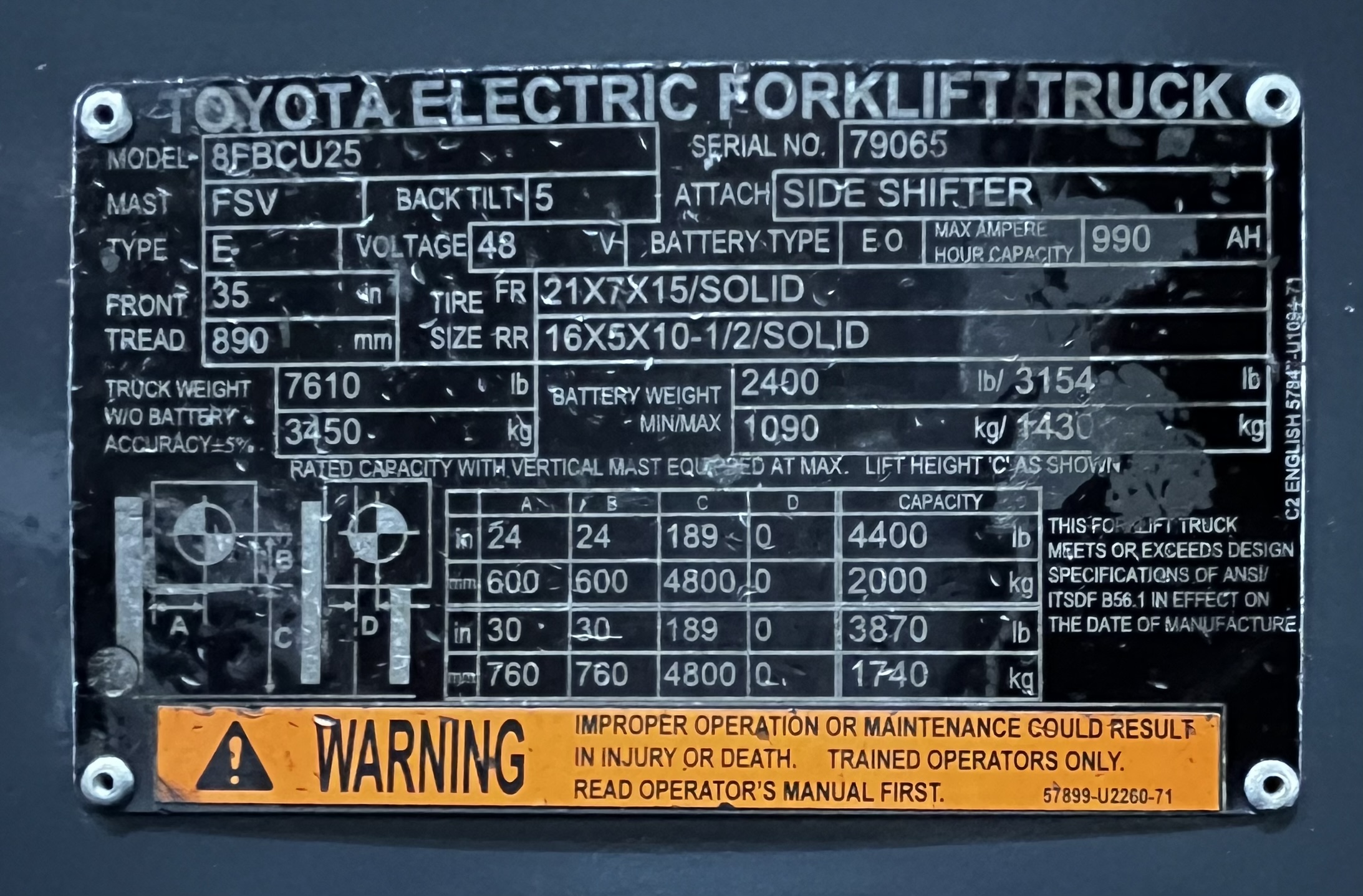 *SOLD* 2019 TOYOTA ELECTRIC 8FBCU25 CUSHION TIRE 5000LB FORKLIFT (262) 547-6637 $19,950.00 Contact for Availability Apply for Financing View Rental Pricing Fuel: Electric Capacity: 5,000 lbs. 3 Mast: 3 Stage Year: 2019 Make: TOYOTA Model # 8FBCU25 Serial # 12345 Hours: 7,222 Side Shifter: Yes Lift Height: 189" Condition: Used Watch this lift in action! YEAR: 2019MAKE: TOYOTAMODEL: 8FBCU25S/N: 79065CAPACITY: 5000HOURS: 7222CUSHION TIRES LIFT HEIGHT: 189"42" CLASS II FORKS36/48 VOLTPOWER STEERINGSIDE SHIFT FORKLIFT DIMENSIONSL: 88" W: 43" H: 83.25"CARRIGE: 36.25"