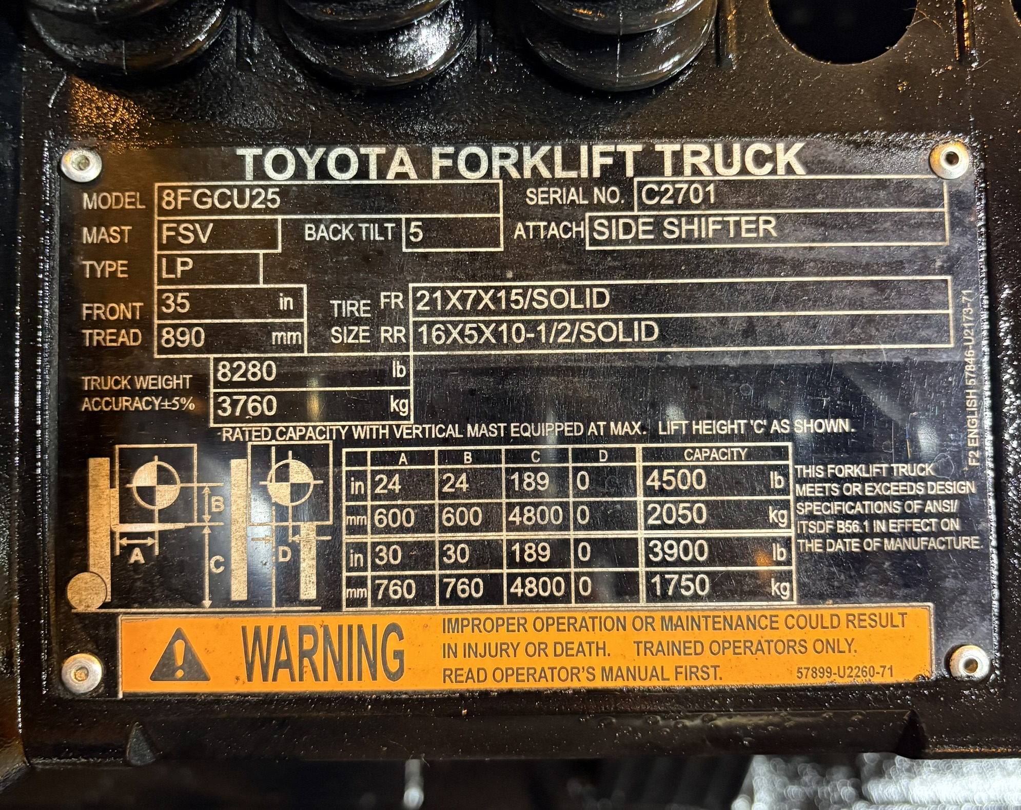 *2021 TOYOTA 8FGCU25 CUSHION TIRE 5000LB FORKLIFT WITH SIDE SHIFT (262) 547-6637 $19,950.00 Contact for Availability Apply for Financing View Rental Pricing Fuel: LP Gas Capacity: 5,000 lbs. 3 Mast: 3 Stage Year: 2021 Make: TOYOTA Model # 8FGCU25 Serial # 12345 Hours: 5,664 Side Shifter: Yes Lift Height: 189" Condition: Used Watch this lift in action! YEAR: 2021MAKE: TOYOTAMODEL: 8FGCU25S/N: C2701CAPACITY: 5000HOURS: 5664CUSHION TRACTION TIRESLIFT HEIGHT: 189"42" CLASS II FORKSSIDE SHIFTPOWER STEERING4Y ENGINEL.P. GAS FORKLIFT DIMENSIONSL: 96" W: 43" H: 83"CARRIGE: 36.25"