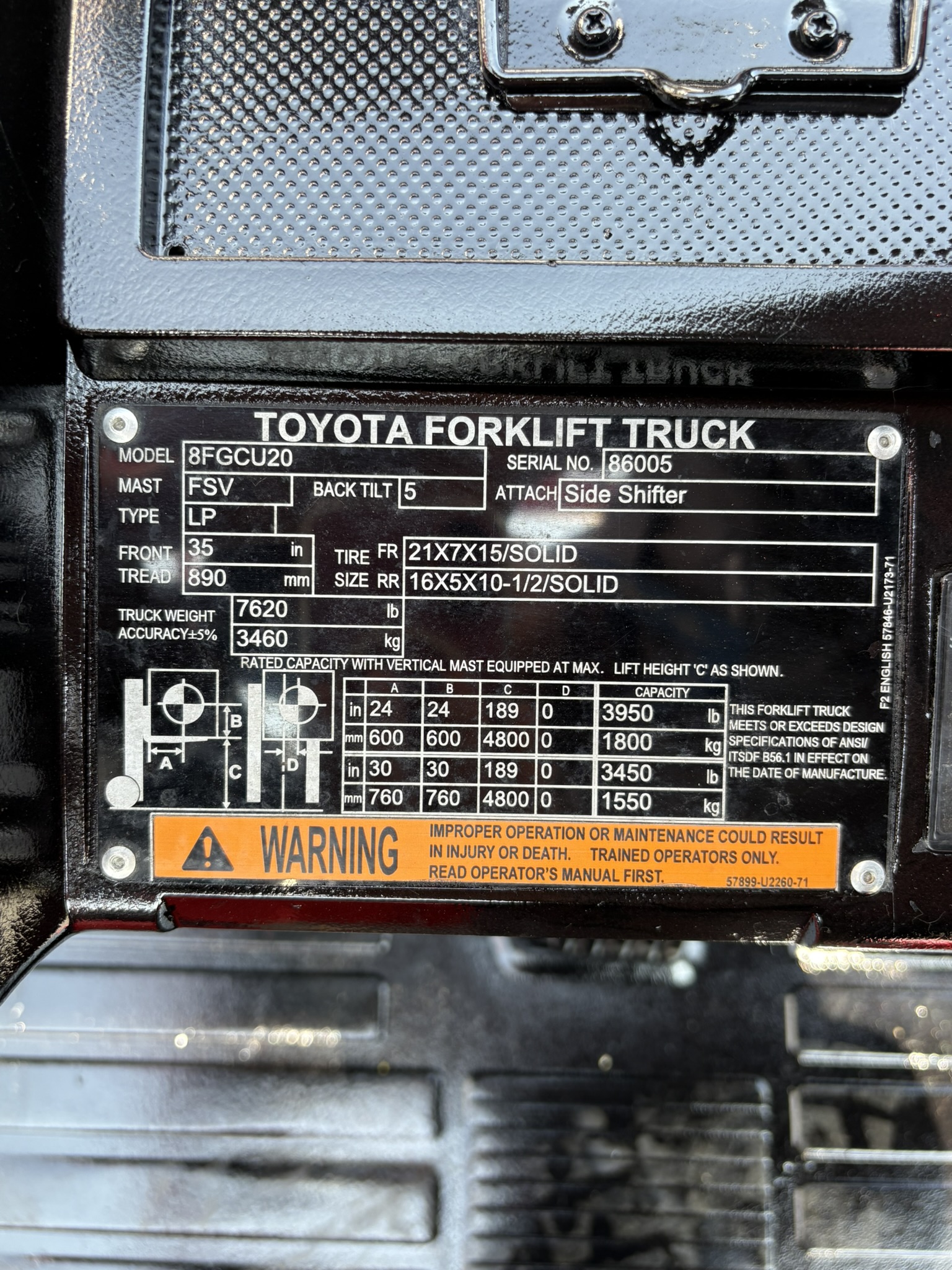*SOLD* 2018 TOYOTA 8FGCU20 CUSHION TIRE 4000LB FORKLIFT (262) 547-6637 $14,950.00 Contact for Availability Apply for Financing View Rental Pricing Fuel: LP Gas Capacity: 4,000 lbs. 3 Mast: 3 Stage Year: 2018 Make: TOYOTA Model # 8FGCU20 Serial # 12345 Hours: 10,914 Side Shifter: Yes Lift Height: 189" Condition: Used Watch this lift in action! YEAR: 2018MAKE: TOYOTAMODEL: 8FGCU20S/N: 86005CAPACITY: 4000HOURS: 10914CUSHION TIRES LIFT HEIGHT: 189"42" CLASS II FORKSSIDE SHIFTPOWER STEERINGL.P. GAS4Y ENGINE FORKLIFT DIMENSIONSL: 94" W: 43" H: 83"CARRIGE: 36.25"